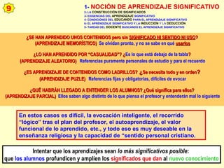 El documento discute el aprendizaje significativo, incluyendo la construcción de significados a través de relaciones sustantivas entre nueva información y conocimientos previos. También describe las exigencias del aprendizaje significativo, como que la información sea lógica y psicológicamente accesible para los estudiantes, y las tareas del docente para guiar a los estudiantes en la construcción de significados y esquemas de conocimiento.