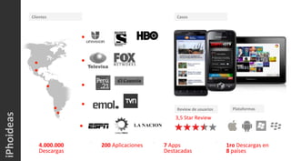 iPhoideas es una compañía fundada en 2008 que se especializa en el desarrollo de aplicaciones móviles. Ha desarrollado más de 200 aplicaciones, con más de 4 millones de descargas y una calificación promedio de usuarios de 3.5 estrellas. iPhoideas ofrece servicios completos de desarrollo, implementación, promoción, monitoreo y optimización de aplicaciones móviles para más de 100 clientes.