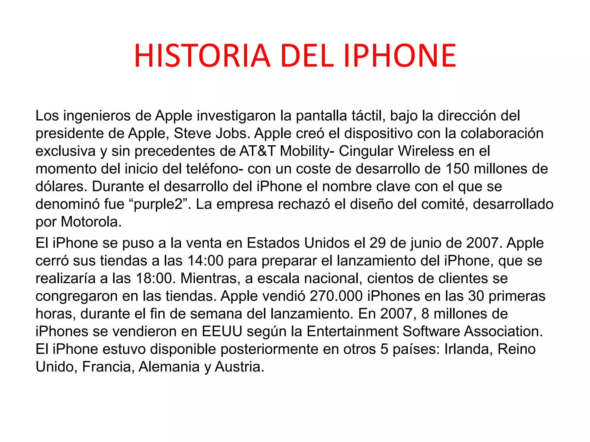 El iPhone fue desarrollado por Apple bajo la dirección de Steve Jobs con un costo de 150 millones de dólares. Fue lanzado en Estados Unidos en 2007 y vendió 270,000 unidades en las primeras 30 horas. El iPhone presentaba una pantalla táctil de 3.5 pulgadas y permitía acceder a aplicaciones y escribir mediante un teclado virtual.
