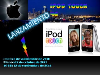 Este documento proporciona información sobre el iPod Touch de 4ta generación. Resume sus características principales como su pantalla de 3.5 pulgadas, cámara frontal y trasera, almacenamiento de hasta 64GB, autonomía de hasta 40 horas reproduciendo música, y compatibilidad con varios idiomas. También describe las mejoras con respecto a generaciones anteriores como un chip y sistema operativo más rápidos, giroscopio de 3 ejes, y un diseño más delgado y liviano.