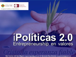 El documento aborda el concepto de 'políticas 2.0' y la importancia de compartir valores en el emprendimiento y la política, ilustrando esta idea a través de la historia de un agricultor que comparte su semilla para beneficiar a la comunidad. Se enfatiza que la responsabilidad social y la creación de valor son fundamentales para el éxito de las organizaciones políticas y empresariales. Además, se plantea que la innovación y la gestión de valores son esenciales para el avance en un entorno social y económico en constante cambio.