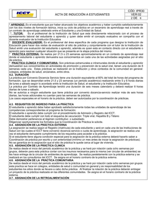 Este documento presenta un resumen de la inducción realizada a los estudiantes que inician su etapa de prácticas en el Instituto Colombiano de Capacitación Técnica (ICCT). Se da la bienvenida a los estudiantes, se presenta a la coordinadora de prácticas y se verifica la asistencia. Adicionalmente, se explican conceptos clave como práctica, convenio docencia-servicio, contrato de aprendizaje, estudiante practicante y aprendiz. Finalmente, se detallan aspectos como la duración y requis