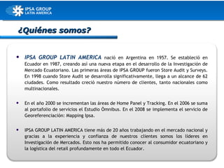 IPSA GROUP LATIN AMERICA se estableció en Ecuador en 1987 y se ha convertido en líder en investigación de mercados en el país. La compañía ofrece una variedad de servicios de investigación de mercados como Store Audit, Home Panel, estudios ad-hoc y ómnibus para ayudar a clientes a comprender mejor a los consumidores ecuatorianos. IPSA GROUP tiene oficinas en Quito, Guayaquil y Buenos Aires.