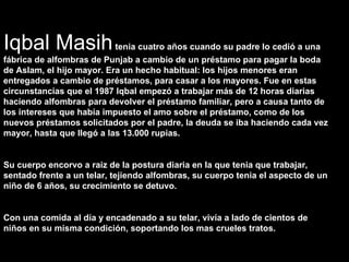 Iqbal Masih fue un niño paquistaní que trabajó en condiciones de esclavitud en una fábrica de alfombras a la edad de 4 años para pagar las deudas de su familia. A los 9 años escapó y se convirtió en activista por los derechos de los niños, denunciando públicamente las malas condiciones laborales de los niños en la industria de las alfombras. Recibió varios premios por su labor, pero también amenazas de muerte. Finalmente fue asesinado a tiros a los 12 años
