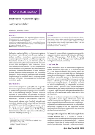 La función respiratoria básica es el intercambio gaseoso de oxígeno y dióxido de carbono entre el aire ambiental y la sangre, lo que requiere un perfecto equilibrio entre los componentes del sistema respiratorio. La insuficiencia respiratoria aguda se define como la incapacidad del sistema respiratorio para realizar este intercambio gaseoso de forma eficaz, lo que puede deberse a la disfunción de los pulmones, la musculatura respiratoria, las vías respiratorias o la red vascular pulmonar.