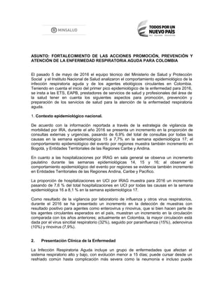 El documento describe el aumento de casos de enfermedad respiratoria aguda en Colombia en 2016, con un incremento en las consultas externas y hospitalizaciones. Se insta a tomar medidas de promoción, prevención y preparación, como la vacunación, vigilancia de brotes, e higiene. Los principales agentes son el virus sincitial respiratorio, parainfluenza, adenovirus y rinovirus. Se pide a los proveedores de salud intensificar la atención oportuna siguiendo las guías del Ministerio de Salud.