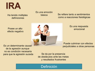 El documento describe la ira y la depresión, detallando sus características fisiológicas, psicológicas y las estructuras cerebrales involucradas. La ira es presentada como una respuesta emocional negativa que se manifiesta a través de reacciones fisiológicas y conductas destructivas, mientras que la depresión se caracteriza por una tristeza persistente y problemas de concentración. Ambos estados emocionales tienen implicaciones biológicas, involucrando la actividad hormonal y neurotransmisores en el cerebro.