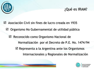 El documento habla sobre IRAM, una asociación civil sin fines de lucro creada en 1935 para estandarizar la normalización en Argentina. También menciona una diplomatura sobre derecho ambiental dictada por IRAM COMAHUE en 2011, que cubre temas como la evolución del derecho ambiental, normas fundamentales como la Constitución, leyes de presupuestos mínimos, principios e instrumentos de gestión ambiental, y régimen de responsabilidad en materia ambiental.