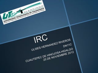 IRC es un protocolo de comunicación en tiempo real basado en texto que permite conversaciones entre dos o más personas a través de canales. Los usuarios se conectan a través de una aplicación cliente a un servidor que gestiona los canales y conversaciones. IRC fue creado en 1988 para reemplazar un programa multiusuario y se inspiró en el chat de la red Bitnet.