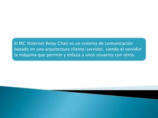 El documento describe el IRC (Internet Relay Chat), un sistema de comunicación basado en cliente-servidor que permite conversaciones entre múltiples participantes a través de canales temáticos. Se originó en 1996 cuando técnicos de diferentes proveedores de internet lo usaron para comunicarse, uniéndose cientos de miles de usuarios rápidamente. IRC-Hispano es una red social basada en IRC en español y opera desde 1996.