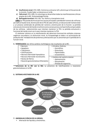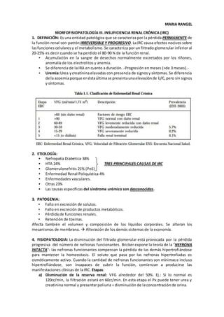 La insuficiencia renal crónica (IRC) se caracteriza por la pérdida permanente y progresiva de la función renal, lo que causa la acumulación de desechos y anomalías en los electrolitos y la sangre. Los principales causas de IRC son la nefropatía diabética, la hipertensión y la glomerulonefritis. La IRC afecta múltiples sistemas del cuerpo y causa anomalías como alteraciones de líquidos y electrolitos, anemia, trastornos cardiovasculares, neurológicos y dérmicos