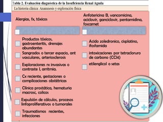 La insuficiencia renal aguda (IRA) se define por un descenso brusco en la tasa de filtración glomerular, manifestándose a través del aumento de creatinina y descenso de diuresis. La clasificación de la IRA incluye causas prerrenales, intrínsecas y postrenales, siendo fundamental el diagnóstico etiológico y el tratamiento específico según la causa. Factores de riesgo como la edad, enfermedades crónicas y ciertos medicamentos pueden predisponer a los pacientes a desarrollar IRA, con implicaciones graves para la mortalidad y la recuperación renal.