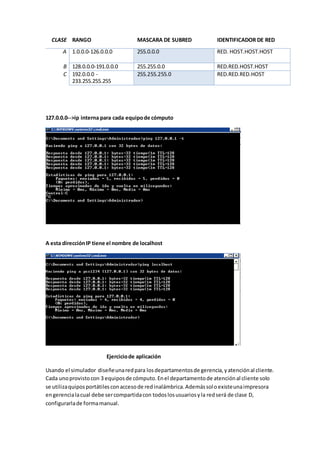 Las direcciones IP clase C se utilizan comúnmente en pequeñas redes como escuelas, oficinas y hogares. Tienen un rango de 192.0.0.0 a 223.255.255.0 y una máscara de red de 255.255.255.0, lo que permite hasta 254 dispositivos por red. Se identifican mediante la notación Red.Red.Red.host. El documento proporciona un ejemplo de topología en estrella con una red clase C y direcciones IP asignadas.