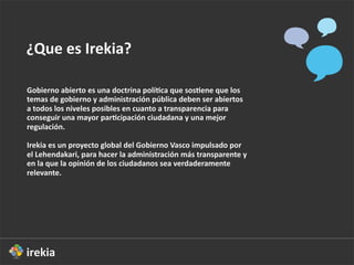Este documento describe el proyecto Irekia del Gobierno Vasco, el cual promueve la transparencia y participación ciudadana. Irekia se basa en tres principios: transparencia, participación y colaboración. Ofrece herramientas para que los ciudadanos colaboren y comenten información del gobierno. Además, provee material audiovisual y agendas para que los medios y ciudadanos puedan seguir las actividades del gobierno. El proyecto usa software libre como Linux, Ruby on Rails y bases de datos para desarrollarse de manera ágil