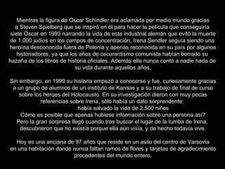 Irena Sendler era una enfermera polaca que salvó a 2,500 niños judíos del Holocausto sacándolos escondidos del gueto de Varsovia y dándoles nuevas identidades. Fue capturada y torturada por los nazis pero se negó a revelar información. Después de la guerra, utilizó registros enterrados para reunir a los niños con familiares o familias adoptivas. Pasó su vida ayudando a otros y no se consideraba una heroína.