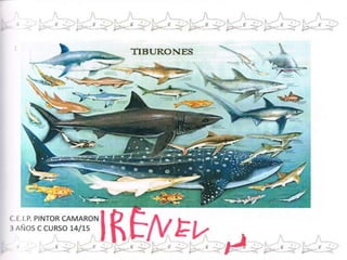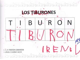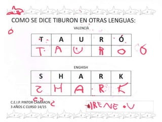 Los estudiantes discuten diferentes características de los tiburones, incluyendo cómo nacen (de huevos o en el interior de su madre), sus habilidades para nadar usando aletas y cola, lo que comen según la especie, y que viven y respiran en el agua salada.