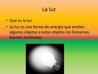 El documento resume conceptos básicos sobre la luz, el magnetismo y la electricidad. Explica que la luz es una forma de energía que emiten objetos luminosos y se propaga en línea recta, y que puede reflejarse o refractarse. También describe los imanes, la electricidad estática, la corriente eléctrica y los circuitos eléctricos. Finalmente, menciona algunos aparatos que usan la electricidad.