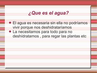 El agua es esencial para la vida y existe en tres estados: sólido (hielo a menos de 0°C), líquido (agua normal en ríos, océanos, etc.) y gaseoso (vapor cuando el agua líquida se calienta). El agua puede cambiar de estado a través del calentamiento y enfriamiento, convirtiéndose en hielo, agua o vapor dependiendo de la temperatura.