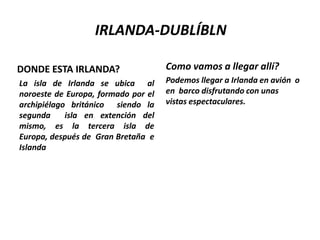 El documento proporciona información sobre Irlanda, incluyendo su escudo de armas, bandera, ubicación, formas de llegar, alojamiento en Dublín, lugares para visitar como el castillo de Kilkenny, actividades como paseos en barco, restaurantes como Fire Restaurant and Lounge que ofrece platos típicos como el estofado de carne a la Guinness, compras de cristal y vidrio, y precauciones para el viaje como llevar el pasaporte y tarjeta sanitaria.
