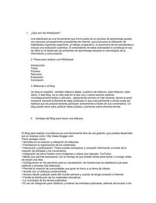 Una webquest es una herramienta de aprendizaje guiado que utiliza recursos de Internet para promover habilidades cognitivas superiores y trabajo cooperativo entre estudiantes. Un blog puede usarse como bitácora y ofrece ventajas como facilidad de uso, organización de contenidos, y participación e interacción entre usuarios. Un portafolio es una colección de trabajos de un estudiante que muestra su progreso y logros, y puede usarse para evaluación y autoevaluación.