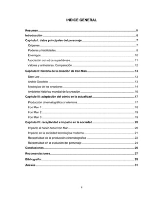 Este documento resume los orígenes y datos principales del personaje de Iron Man. Tony Stark es un multimillonario ingeniero que crea una armadura para escapar después de ser herido en Vietnam. Más tarde rediseña la armadura para usarla como superhéroe con poderes como reflejos sobrehumanos y la capacidad de conectarse a sistemas de comunicación. El documento también analiza la creación de Iron Man y su popularidad debido a las películas de Marvel.
