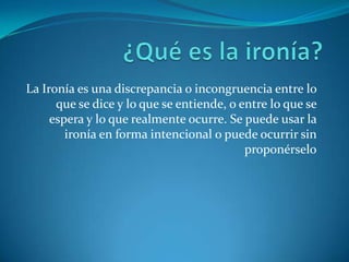 La ironía se produce cuando hay una discrepancia entre lo que se dice y lo que se entiende o entre lo que se espera y lo que realmente ocurre. La risa puede ser una forma de expresar ironía o sarcasmo y ayuda a liberar endorfinas y tensiones, por lo que tiene beneficios para la salud y el bienestar psicológico.
