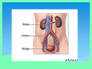 El documento describe el sistema urinario, incluyendo los riñones, ureteres, vejiga urinaria y uretra. Los riñones filtran la sangre para formar la orina, los ureteres transportan la orina a la vejiga, que almacena la orina hasta la micción a través de la uretra.