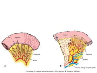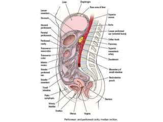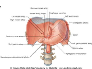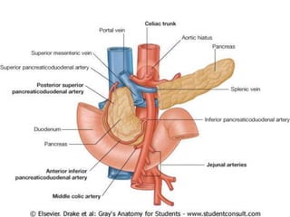 Este documento describe la irrigación arterial del abdomen. La arteria principal es la aorta abdominal, que se extiende desde T12 hasta L4. Proporciona las arterias anteriores, laterales y posteriores. Sus ramas terminales son las arterias ilíacas primitivas. Describe las arterias anteriores como las frénicas inferiores, el tronco celíaco, la mesentérica superior y la mesentérica inferior. Resume las ramas y funciones de las arterias hepática, gastroduodenal, mesentérica superior, mesentérica inferior y renales