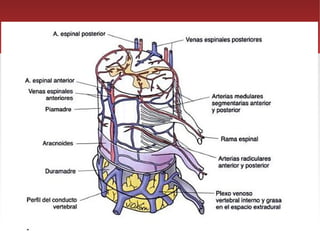 El documento describe la irrigación arterial de la médula espinal. La médula espinal recibe sangre de tres arterias espinales longitudinales principales (anterior, posteriores y la arteria radicular mayor de Adamkiewicz) y de ramas segmentarias. La irrigación varía en las diferentes regiones de la médula, con la región lumbosacra teniendo la mejor irrigación. El drenaje venoso se realiza a través de plexos venosos vertebrales internos y externos.