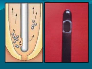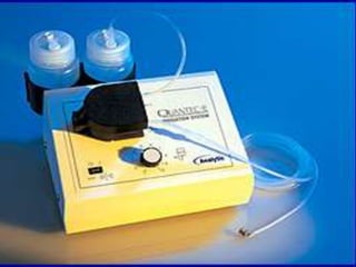 Este documento describe diferentes soluciones irrigadoras utilizadas en endodoncia, incluyendo hipoclorito de sodio, clorhexidina, EDTA, y asociaciones como EDTAC. Explica sus propiedades químicas, mecanismos de acción, y efectividad contra microorganismos. También analiza factores que influyen en la eficacia de la irrigación y nuevas tecnologías como ultrasonido y láser.