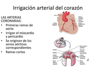 El documento resume la irrigación arterial del corazón. Las arterias coronarias principales son la arteria coronaria derecha y la izquierda, las cuales nacen de la aorta y suministran sangre al miocardio. Cada arteria da origen a varias ramas que irrigan diferentes regiones del corazón. Existen variaciones en el patrón de irrigación entre individuos.