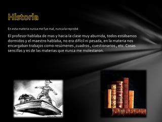 El estudiante tuvo éxito en algunas materias como historia y orientación, las cuales encontró sencillas con trabajos fáciles. Tuvo dificultades en química, matemáticas y español, repitiendo matemáticas varias veces a pesar de esforzarse. Aunque algunos maestros explicaban bien, otros como el de español no lo hacían claramente o eran exigentes. En general, el estudiante logró aprobar la mayoría de las materias a pesar de los retos.
