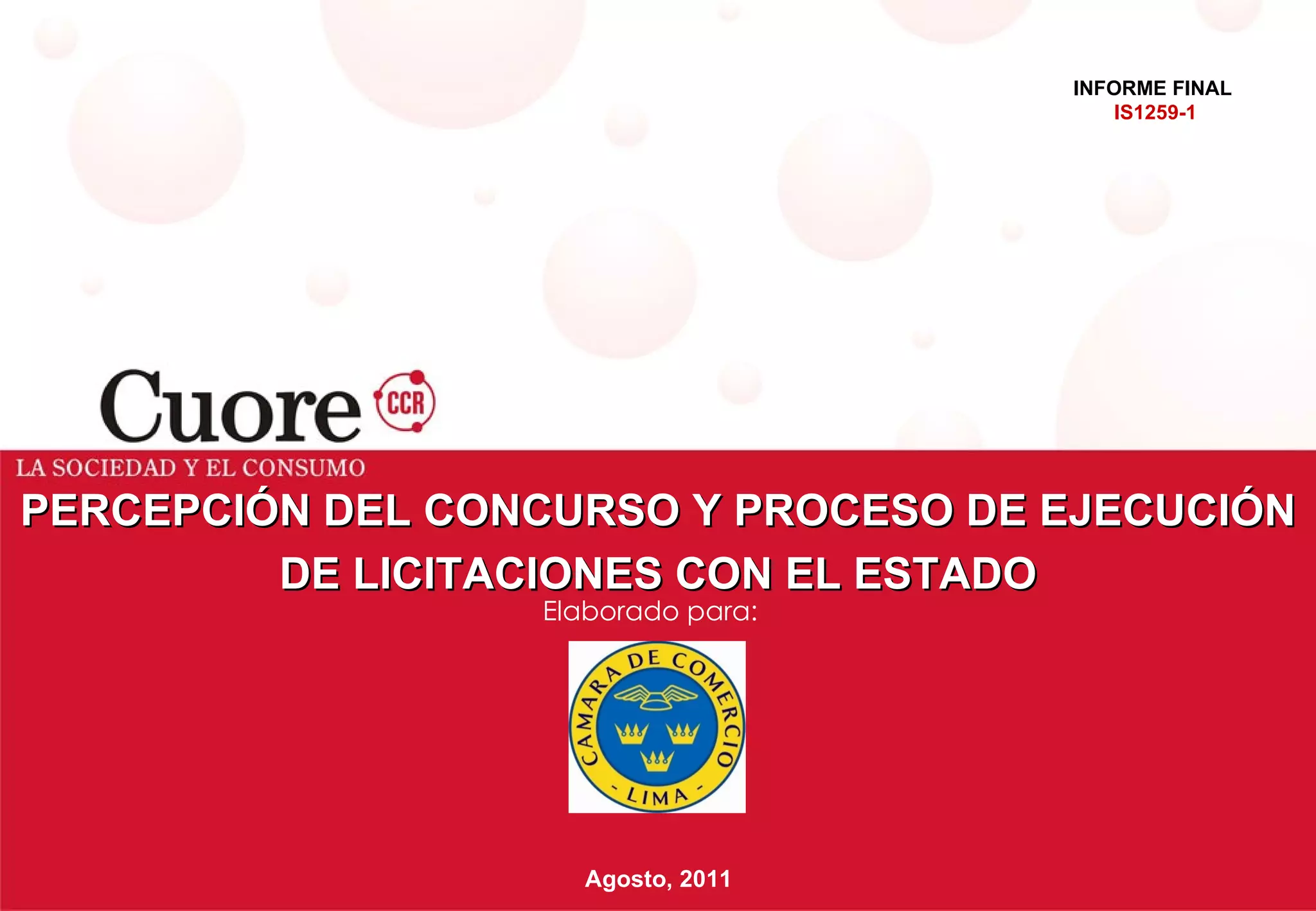 El documento presenta los resultados de una encuesta realizada a 500 empresas sobre su percepción de los procesos de licitación con el estado. Las principales razones por las que las empresas participan en licitaciones son por oportunidades para ofrecer sus productos/servicios al estado, por invitación estatal y por contar con los requisitos. Las empresas también dieron sugerencias para mejorar los procesos, como simplificar los requisitos, agilizar los pagos y mejorar la transparencia. Cada tipo de empresa tuvo razones diferentes para no haber ganado licitaciones en