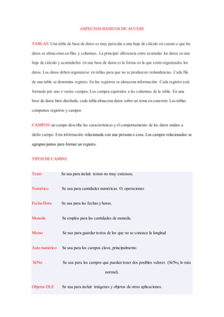 Las tablas de una base de datos almacenan datos en filas y columnas de forma similar a las hojas de cálculo, pero los datos deben organizarse para evitar redundancias. Cada fila de una tabla se denomina registro y contiene uno o más campos, que equivalen a las columnas. Los campos describen las características de los datos y se agrupan en registros. Las tablas se relacionan entre sí para mantener la integridad referencial y evitar registros huérfanos en la base de datos.