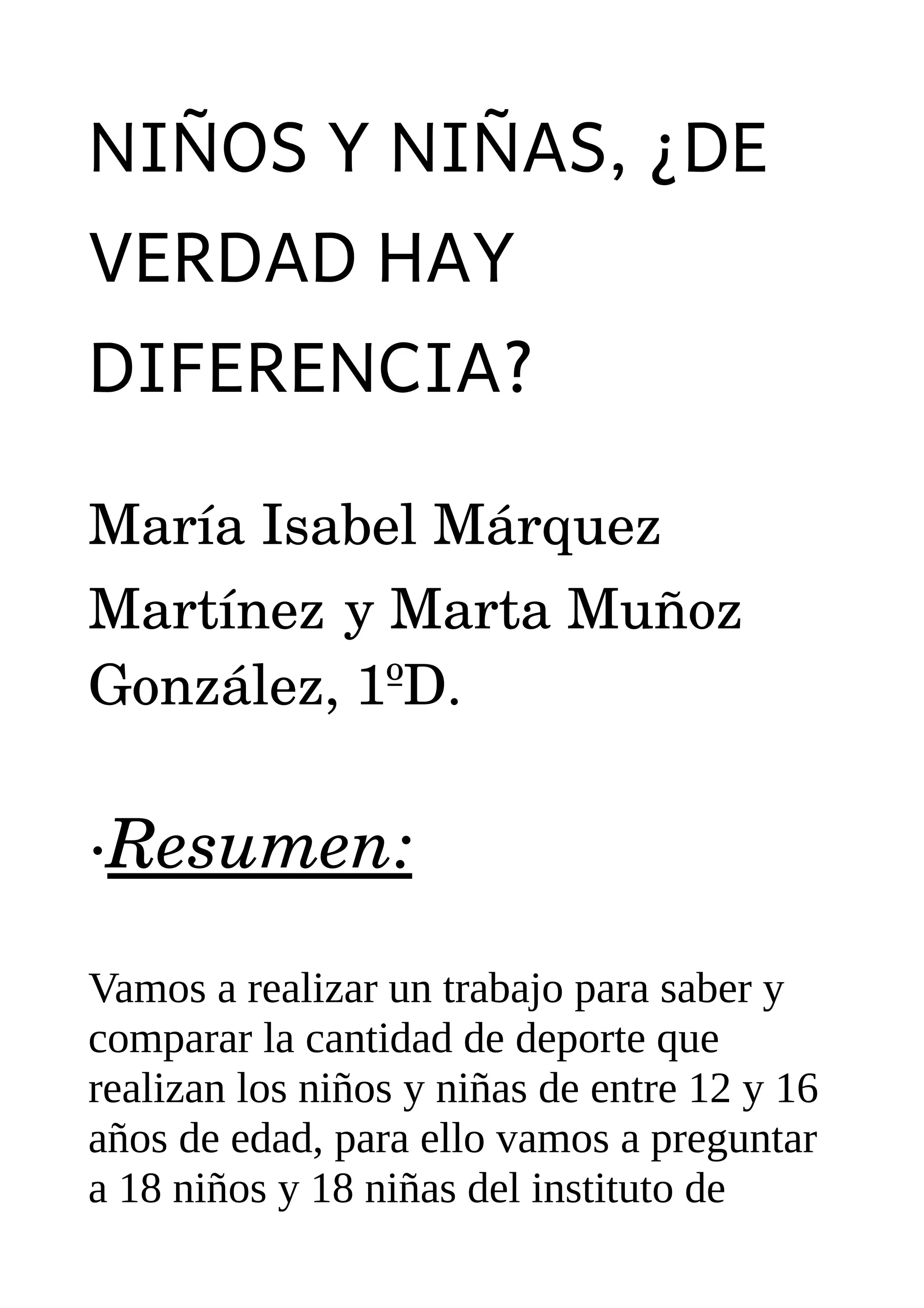 El documento presenta los resultados de una encuesta realizada a 18 niños y 18 niñas para comparar la cantidad de horas de deporte que realizan cada semana. Los resultados muestran que los niños dedican una media de 6,25 horas a la semana al deporte, mientras que las niñas dedican una media de 3,43 horas. Aunque los niños siguen practicando más deporte que las niñas, la brecha se ha reducido gracias a un mayor interés de las niñas en la práctica deportiva.