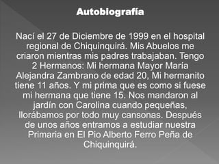 La autobiografía resume la vida de la autora hasta el momento. Nació en 1999 en Chiquinquirá y fue criada por sus abuelos mientras sus padres trabajaban. Asistió a la escuela primaria Pio Alberto Ferro Peña en Chiquinquirá y actualmente estudia en el prestigioso Liceo Nacional José Joaquín Casas, donde se ha destacado en música, deportes y ha conocido a sus mejores amigas. A través de las experiencias de su vida, la autora ha aprendido a perdonar y a amar a las