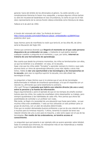 Isaac Asimov fue un escritor y científico estadounidense nacido en Rusia en 1920. Se destacó por su obra de ciencia ficción que incluyó las historias de robots y la saga Fundación. Tuvo una visión de que la educación del siglo XXI incorporaría las tecnologías como complemento al aprendizaje, permitiendo una relación individual entre el estudiante y la fuente de información. Su estilo sencillo hizo que sus ideas sobre el futuro de la educación sean accesibles a muchos.