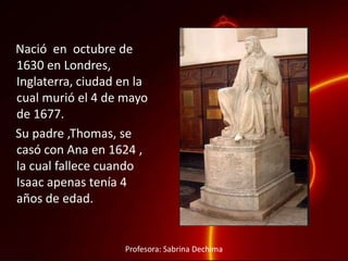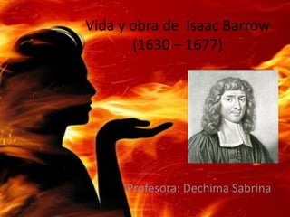 Isaac Barrow (1630-1677) fue un matemático y teólogo inglés. Recibió una educación temprana en latín, griego y hebreo que le permitió ingresar a la Universidad de Cambridge donde se graduó en 1649. Más tarde se convirtió en profesor de matemáticas en la misma universidad, donde tuvo como alumno a Isaac Newton. Barrow realizó importantes contribuciones a las matemáticas y la óptica a través de sus publicaciones Lectiones Mathematicae, Lectiones Geometricae y Lectiones Opt