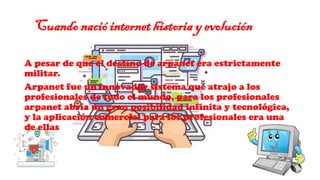 La historia del internet se remonta a 1969 con la creación de ARPANET por el departamento de defensa de EE.UU. para hacer las comunicaciones militares menos vulnerables. Aunque era para uso militar, ARPANET atrajo a profesionales de todo el mundo y abrió posibilidades tecnológicas. El internet comenzó a crecer en 1985 con 2000 computadoras conectadas y experimentó un rápido crecimiento en la década de 1990 con la aparición de las computadoras personales y el World Wide Web.