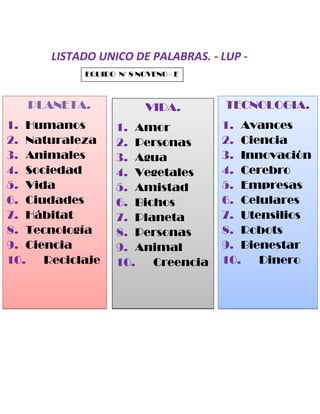 El documento presenta tres listas de 10 palabras cada una sobre temas relacionados con el planeta, la vida y la tecnología, incluyendo palabras como humanos, naturaleza, animales, sociedad sobre el planeta; amor, personas, agua, vegetales, amistad sobre la vida; y avances, ciencia, innovación, cerebro sobre tecnología.