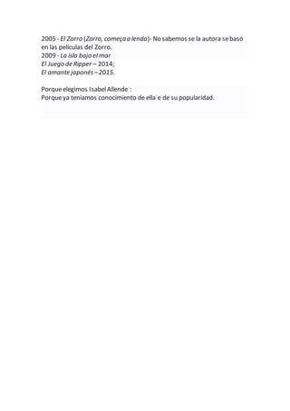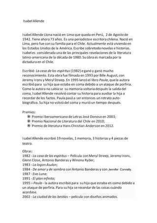 Isabel Allende, nacida en Lima en 1942, es una destacada periodista y escritora chilena. Considerada una de las figuras más importantes de la literatura latinoamericana, sus obras, como 'La casa de los espíritus' y 'Paula', reflejan experiencias personales y el contexto histórico de Chile. A lo largo de su carrera, ha recibido numerosos premios literarios y ha publicado 19 novelas, además de memorias y teatro.