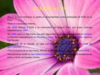 Isabel Allende es una escritora chilena que nació en Perú mientras su padre trabajaba como embajador de Chile. Se nacionalizó chilena y vivió periodos en Europa antes de establecerse en California después de la muerte de su hija. Allende es conocida por sus novelas que incluyen La casa de los espíritus y otras obras como Eva Luna, Hija de la fortuna, e Inés del alma mía.