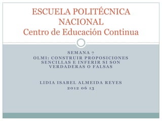 Este documento resume una lección en una escuela infantil donde los niños aprenden conceptos lógicos y matemáticos como proposiciones, tablas de doble entrada y verdadero vs. falso a través de juegos y actividades prácticas como construir una matriz sobre sus juguetes favoritos. La educadora evalúa el progreso de los niños y concluye que han demostrado aprendizajes significativos al potenciar sus capacidades a través de una enseñanza afectiva y basada en la pregunta.