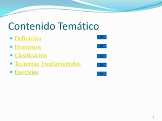 Este documento trata sobre triángulos. Define los triángulos y sus elementos principales como lados y vértices. Clasifica los triángulos según sus lados en equilátero, isósceles y escaleno, y según sus ángulos en agudos, obtusos y rectángulos. Presenta cuatro teoremas fundamentales sobre triángulos. Finalmente, incluye dos ejemplos resueltos de problemas geométricos sobre triángulos.
