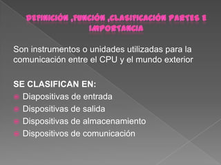 Los dispositivos de entrada permiten ingresar información a la computadora, los dispositivos de salida visualizan la información, los dispositivos de almacenamiento guardan la información en la computadora, y los dispositivos de comunicación establecen redes entre computadoras. Algunos ejemplos son teclados, mouse, cámaras y lápices ópticos para entrada; monitores e impresoras para salida; discos duros, memorias flash y CDs/DVDs para almacenamiento; y módems, switches y routers para comunicación.