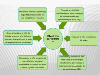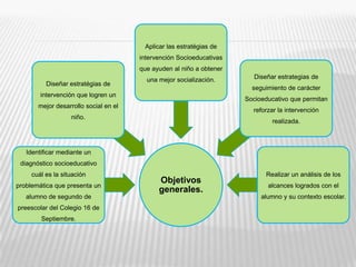 Este documento presenta un proyecto de intervención socioeducativa para mejorar los problemas de conducta de un niño preescolar que le afectan para la socialización. El proyecto incluye un diagnóstico del niño, un marco de referencia sobre problemas de conducta infantil y estrategias de intervención como juegos, canciones y videos para fomentar la socialización del niño con sus compañeros y padres. El objetivo final es que el niño pueda relacionarse mejor con los demás a través de estas actividades socioeducativas.