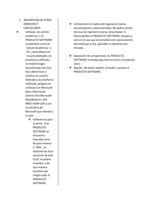 Este documento resume las condiciones de licencia para el uso de un software. Indica que el software está protegido por leyes de derechos de autor y que se concede bajo licencia en lugar de venderse. Detalla los derechos concedidos por la licencia como instalar una copia del software en un solo equipo y hacer una copia adicional para uso portátil. También permite almacenar una copia en un servidor de red para instalar en otros equipos dentro de una red interna, requiriendo una licencia por cada equipo. Incluye otras restricciones como