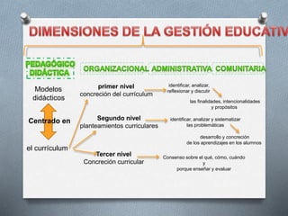 Este documento describe tres niveles de un modelo didáctico centrado en el currículum. El primer nivel implica identificar las finalidades e intencionalidades del currículum. El segundo nivel implica analizar las problemáticas del desarrollo curricular y cómo concretar los aprendizajes de los estudiantes. El tercer nivel implica llegar a un consenso sobre qué, cómo, cuándo y por qué enseñar y evaluar de acuerdo al currículum. También describe cómo los diferentes actores educativos participan en el desarrollo del