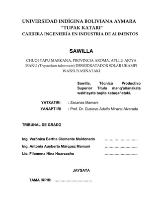 Este documento describe una investigación sobre la deshidratación solar del isañu (Tropaeolum tuberosum) con tres objetivos: 1) agregar valor al isañu a través de la deshidratación, 2) revalorizar culturalmente el isañu, y 3) revalorizar económicamente este tubérculo. Se construyó un deshidratador solar a escala piloto que tuvo éxito deshidratando isañu por radiación solar.