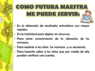 El documento describe varias herramientas tecnológicas que pueden usarse en el aula como software educativo interactivo, blogs, internet, celulares, aulas de medios, calculadoras, DVDs y proyectores. Explica cómo estas herramientas pueden facilitar el aprendizaje de los estudiantes y hacer las lecciones más interesantes e innovadoras.